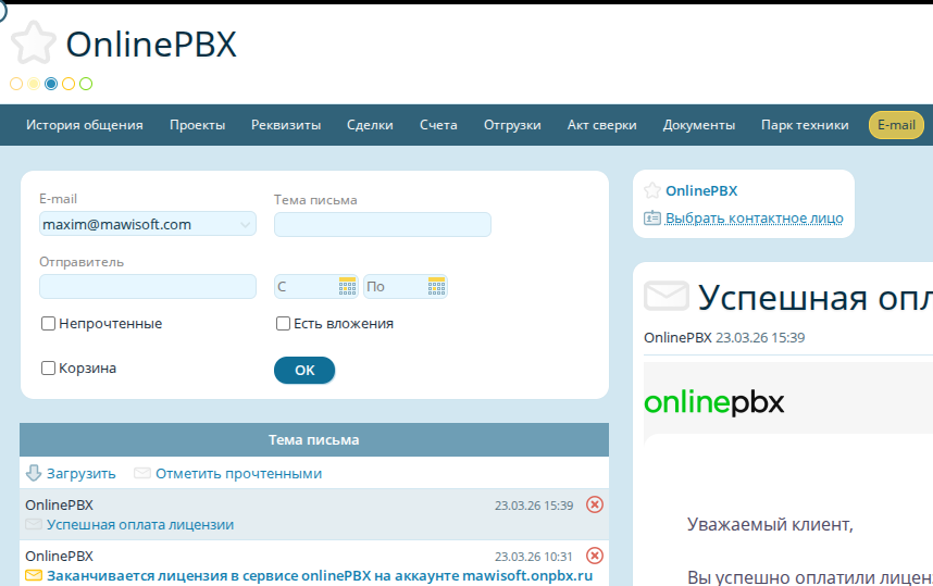 Вы можете просматривать все письма от выбранного клиента непосредственно в карточке этого клиента, а так же сохранять те документы, которые прикреплены к письмам в CRM